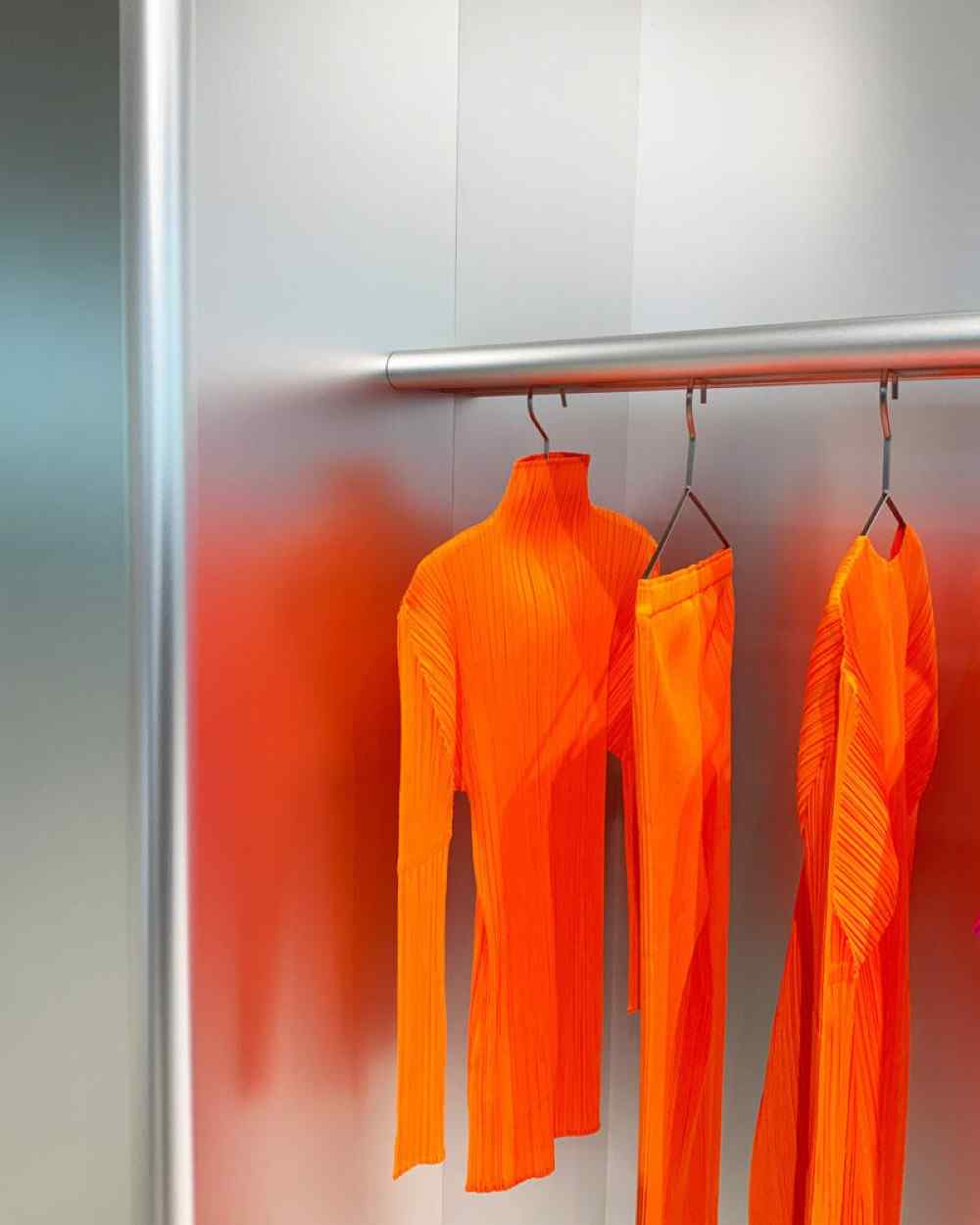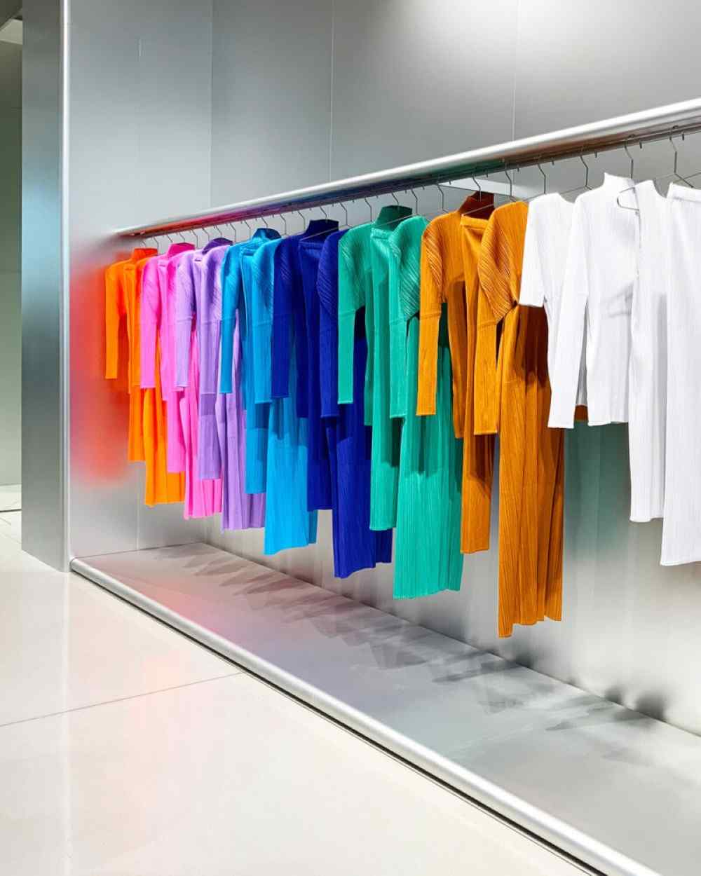 Pièce maîtresse de la boutique, le « Pleats Wall » agit comme une représentation vivante du processus de production innovant d'Issey Miyake. De grands panneaux de couleur rappellent les étapes de transformation du textile : le tissu plié, pressé, puis façonné jusqu'à obtenir sa forme sculpturale. Exposés le long du rez-de-chaussée, ces textiles fraîchement plissés, venus directement de l'usine, injectent une impulsion visuelle et un éclat de couleur dans cet espace autrement minimaliste.