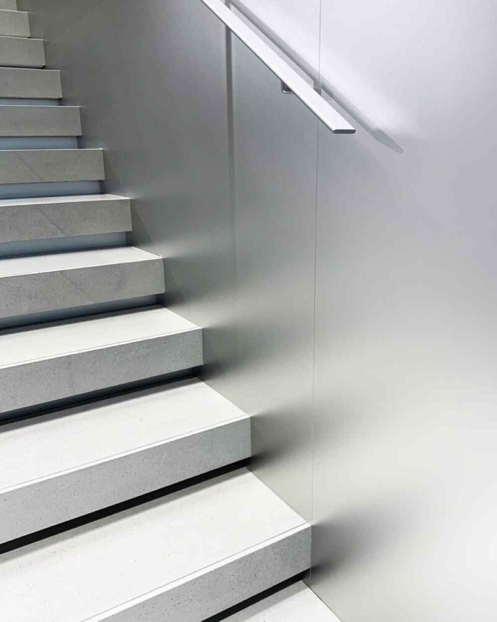 Lignes pures et lumière uniforme définissent une atmosphère d'une profonde sérénité. La lumière glisse sur le métal et se diffuse à travers les cloisons, adoucissant l'espace tout en préservant sa rigueur structurelle. Cet équilibre crée un environnement à la fois ancré et aérien, où l'architecture et le vêtement font écho par leur discipline et leur rythme communs.