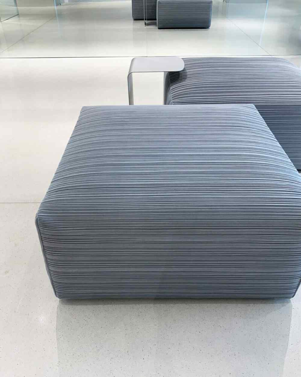 L'ADN visuel du projet, structuré et léger, se décline dans les moindres détails. On le retrouve ainsi dans le « Pleats Sofa » (Canapé Plissé), qui fait écho aux vêtements qu'il accompagne.