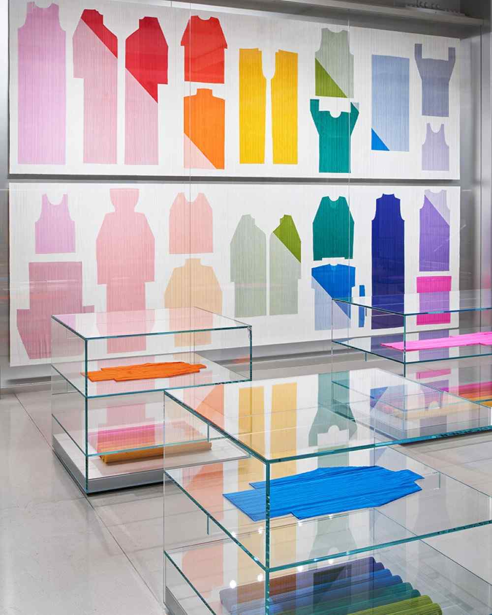 Pièce maîtresse de la boutique, le « Pleats Wall » agit comme une représentation vivante du processus de production innovant d'Issey Miyake. De grands panneaux de couleur rappellent les étapes de transformation du textile : le tissu plié, pressé, puis façonné jusqu'à obtenir sa forme sculpturale. Exposés le long du rez-de-chaussée, ces textiles fraîchement plissés, venus directement de l'usine, injectent une impulsion visuelle et chromatique dans cet espace autrement minimaliste.