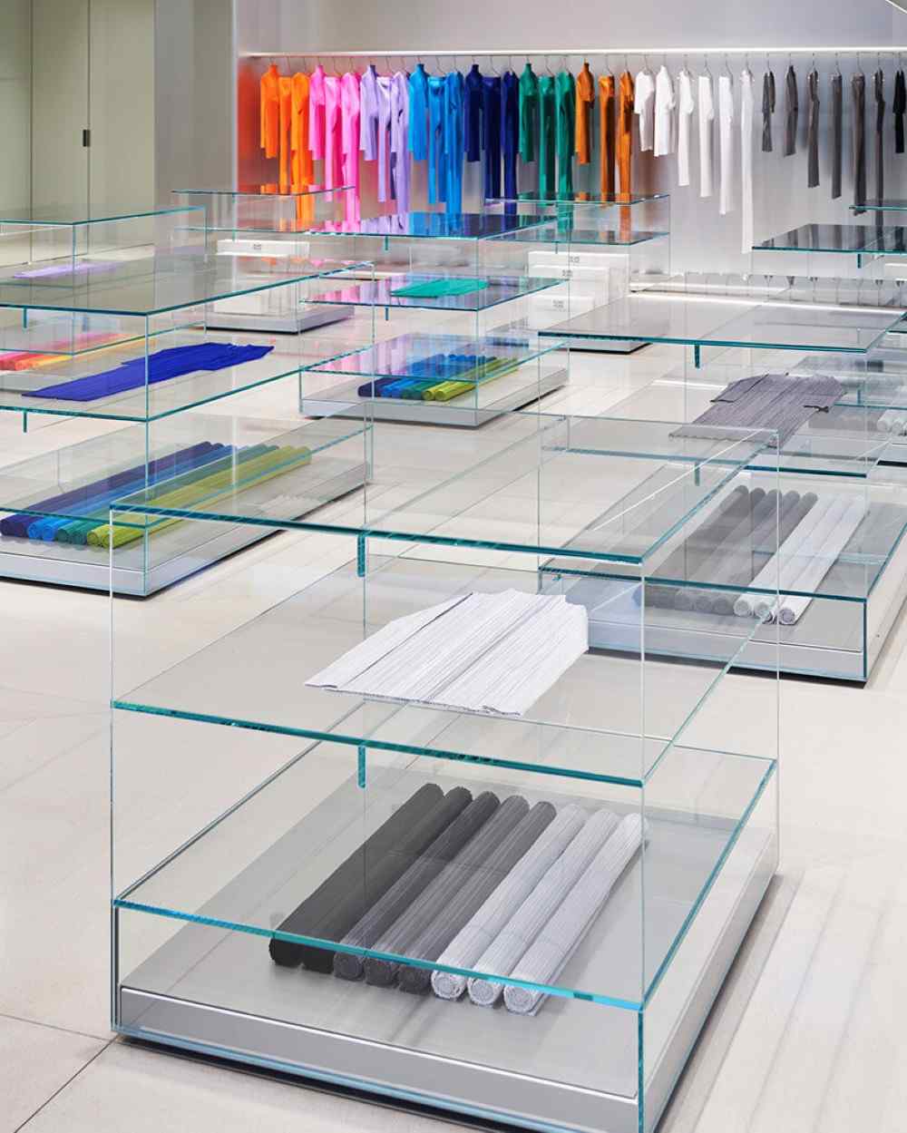 À l'intérieur de ces écrins de verre, les vêtements plissés sont roulés et disposés en une subtile progression chromatique. Cette présentation apporte un contraste ludique à la retenue et au calme des surfaces environnantes.