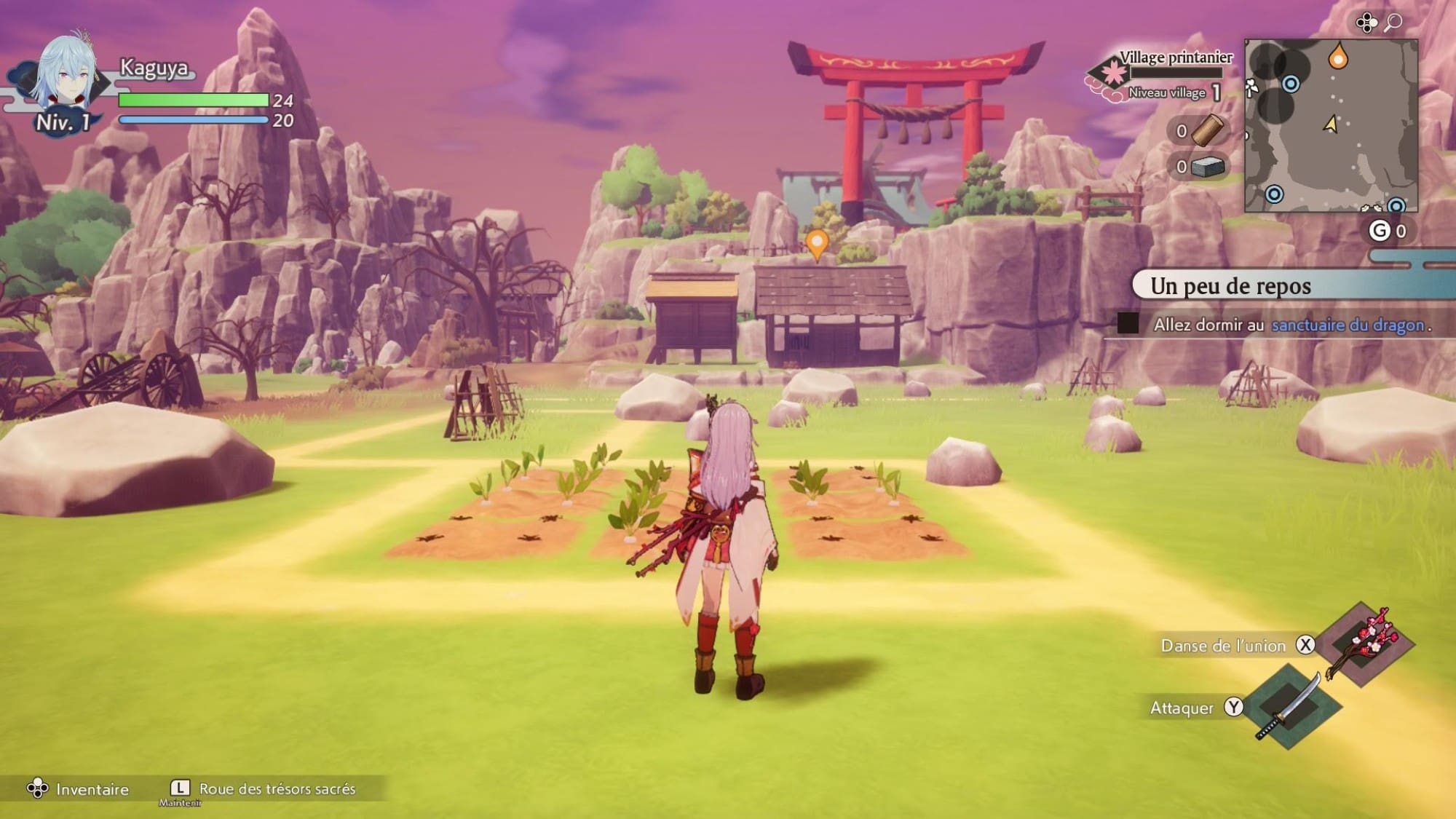 Contrairement aux décors médiévaux occidentaux habituels des Rune Factory (et de tout bon isekai), Guardians of Azuma opte pour un Japon fantasmé — rizières et sanctuaires, une rupture rafraîchissante qui ancre l'agriculture dans une esthétique shintô.