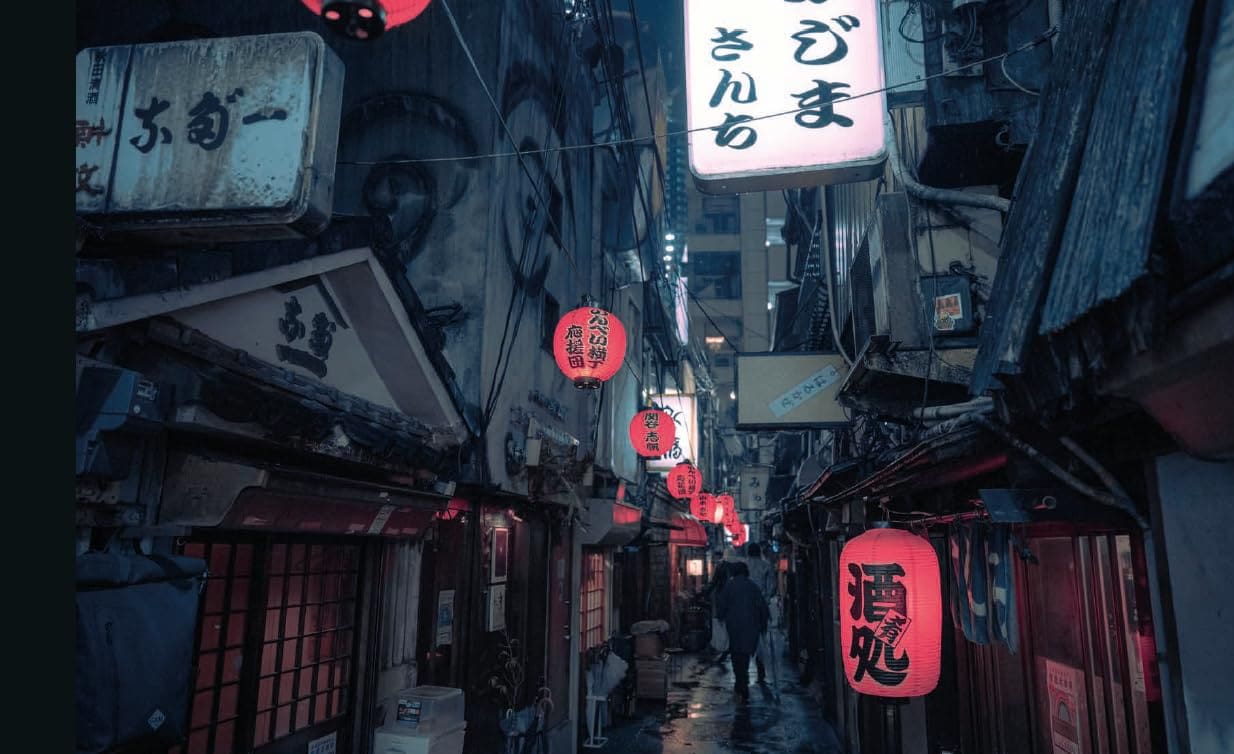 On traverse ainsi les icônes, mais toujours avec ce filtre nocturne. Asakusa est là, mais c'est le temple Senso-ji vidé de ses touristes, sous un ciel d'encre. Shibuya n'est pas seulement son "crossing", mais aussi ses izakaya cachés dans les ruelles de Nonbei Yokocho. Shinjuku se déploie entre ses gratte-ciels et l'intimité presque anachronique de Golden Gai.