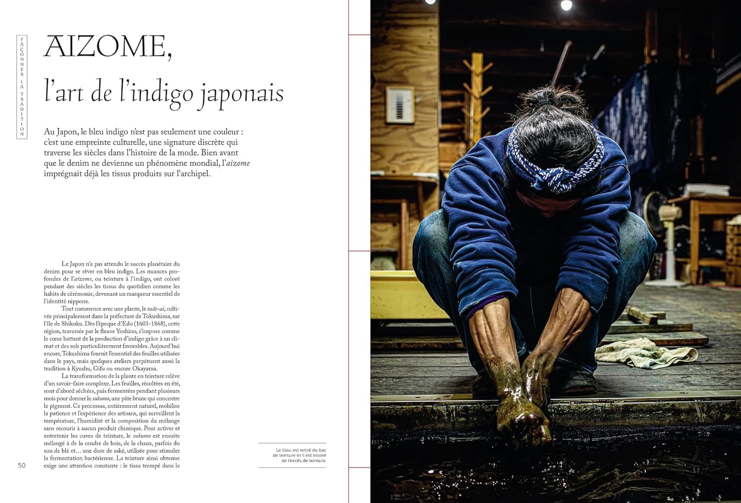 Le livre met en lumière ces "Trésors nationaux vivants" (Ningen Kokuho), ces hommes et femmes qui consacrent leur vie à la perfection d'une technique. On y découvre la fascination pour l'indigo (Aizome), cette couleur profonde qui semble contenir l'âme du Japon rural, ou encore l'incroyable épopée du denim. C'est l'un des passages les plus captivants : comment le Japon, fasciné par l'Amérique d'après-guerre et ses G.I., s'est approprié le jeans pour finalement le sublimer. Aujourd'hui, le denim d'Okayama, tissé sur de vieux métiers à navette Toyoda et teint à l'indigo naturel, est considéré comme le meilleur au monde. Ce chapitre illustre à lui seul le génie japonais : l'art d'absorber une influence extérieure pour la restituer avec une qualité technique obsessionnelle.