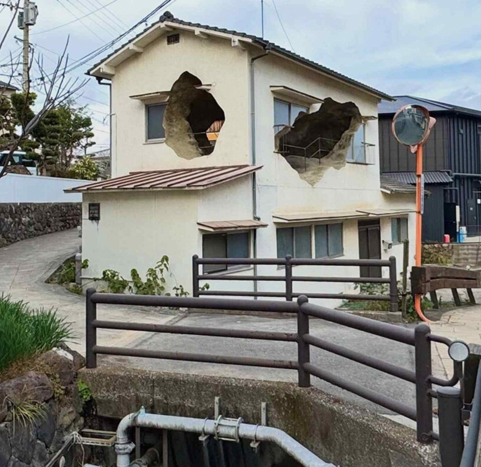 L'installation joue sur la perte de repères. Des mains courantes minimalistes tracent un chemin à travers la cavité, offrant juste assez d'appui pour avancer sans neutraliser l'expérience viscérale du lieu. La lumière naturelle s'infiltre par des ouvertures irrégulières, attirant dans l'obscurité des fragments de Kannawa : un bout de toit, une rue, des silhouettes de passants. Le visiteur est invité à regarder le monde extérieur à travers ces « trous », redécouvrant ainsi le paysage familier de la ville comme une terre étrangère.